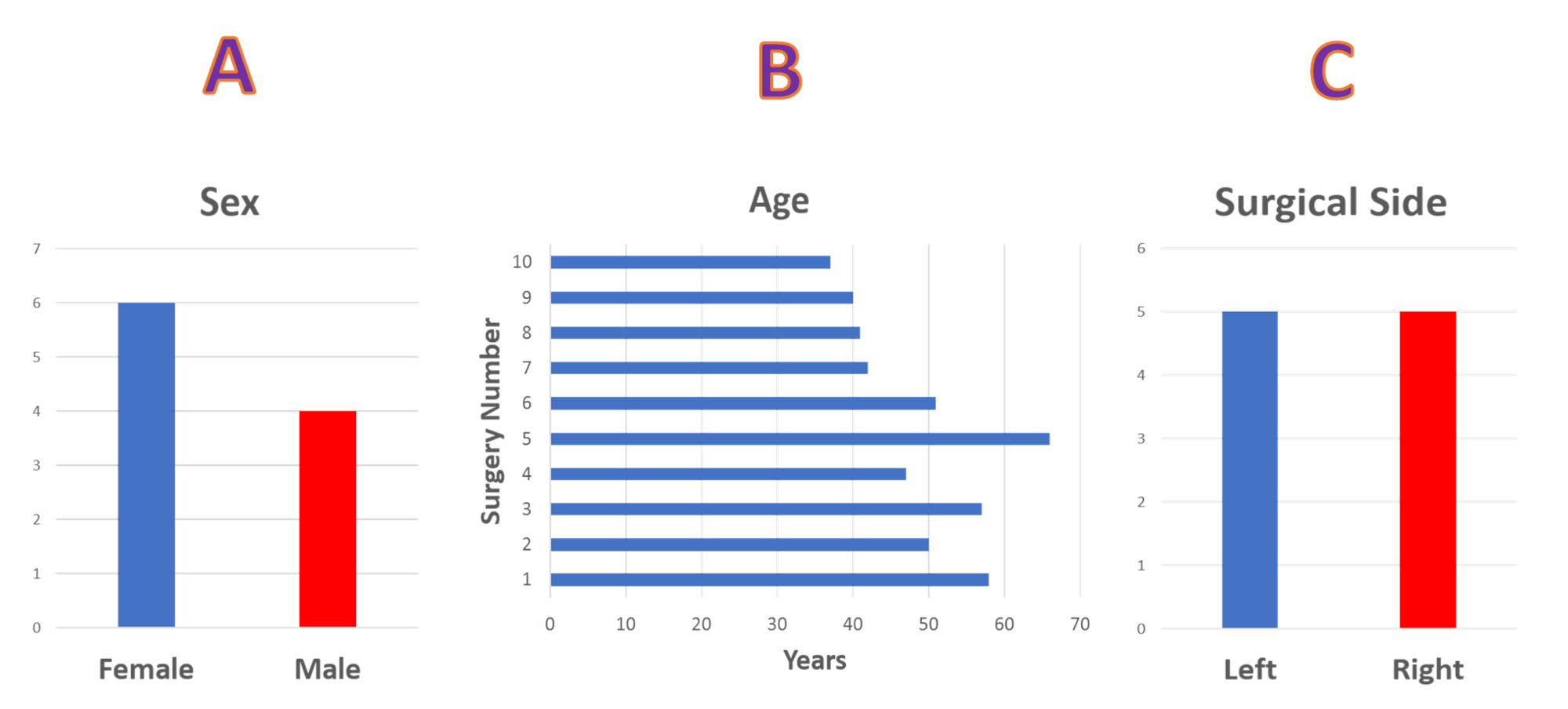 Figure 1: Sex, Age and Operative Side Statistical data showing (A) gender distribution of six females and four male patients. (B) age distribution and (C) surgical side, five left-sided and five right-sided surgical procedures.