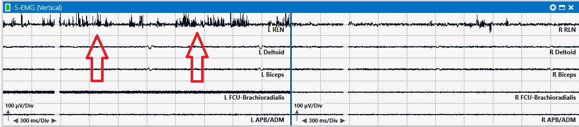 Figure 1: Abnormal EMG activity in the left recurrent laryngeal nerve recorded during an anterior cervical discectomy and fusion surgery.